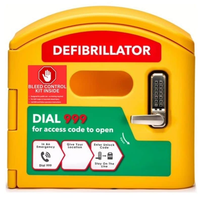 DefibCaddy External Locked Defibrillator Cabinet & STOP THE BLEED Sticker